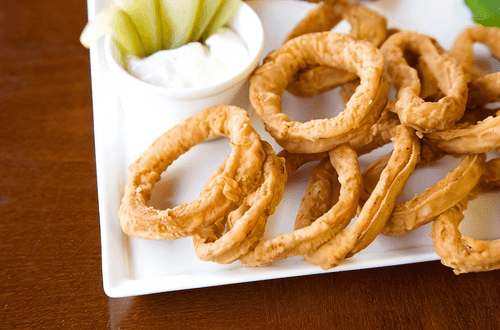 Onion rings with sweet and sour sauce