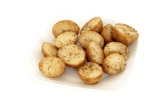 Cut the potatoes and place them in a non-metallic container, add a tablespoon of water. Cover with film and poke it with a fork. Microwave for 3 minutes until the potatoes are soft.