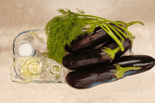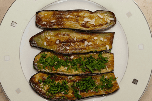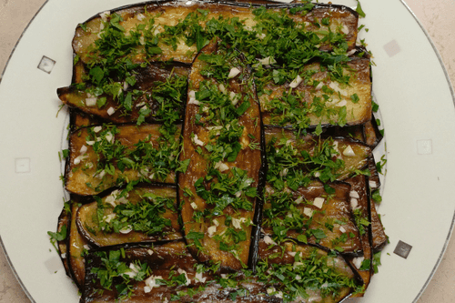 Layer the following eggplants, garlic, and greens so that each subsequent layer is placed across the previous one. Cover with a plate on top and refrigerate for at least 3 hours.