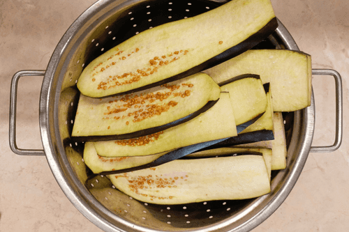 Sprinkle the eggplant slices with coarse salt and let them drain in a colander for 15-20 minutes.