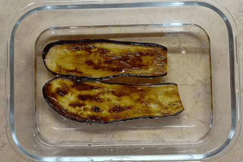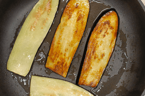 Fry the eggplants in vegetable oil over high heat until golden brown on each side. Fry in batches in a single layer. Place all the pieces in a bowl.