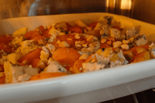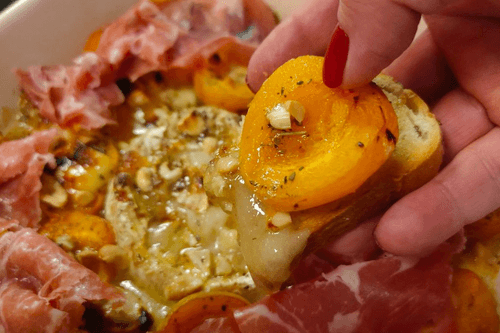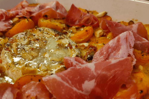 Apricots baked with brie cheese, dorblu, nuts and ham