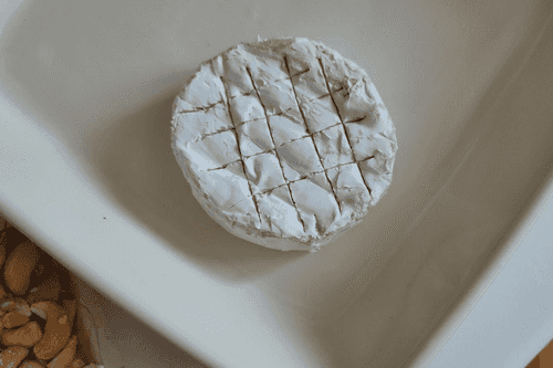 Unwrap the brie cheese, cut the top, then place it in a baking dish.