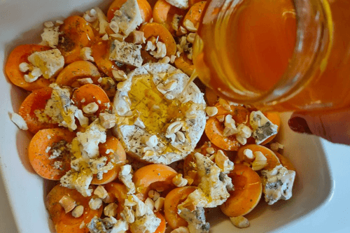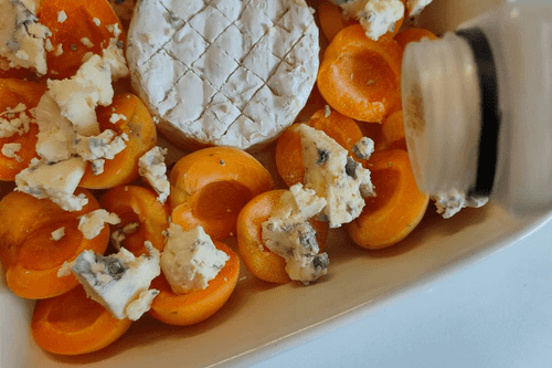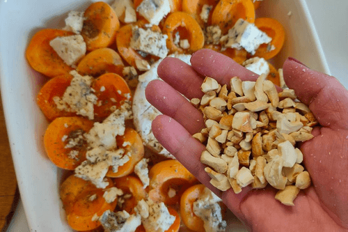 Cut the Dorblu into small pieces and sprinkle it on top of the apricots.