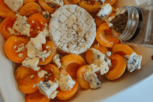 Sprinkle dried garlic on apricots with cheese.