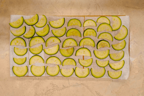 Cut the zucchini in half lengthwise and into half-circle slices 2 mm thick.