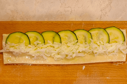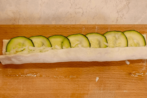Lay the slices of zucchini along the long side of the strips so that they do not reach the center and stick out over the edge.
