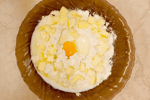 Sift the flour into a bowl and make a well in the center. Add salt to the milk, pour it into the well in the flour, add one egg, and place the diced cold butter (90 grams) around the edge of the well.