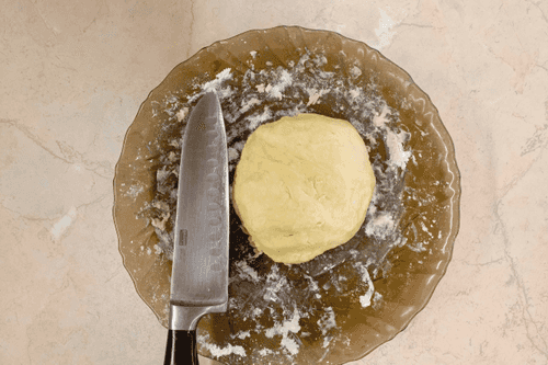 Mix the ingredients, chop them with a knife into coarse crumbs, and quickly knead an elastic dough.