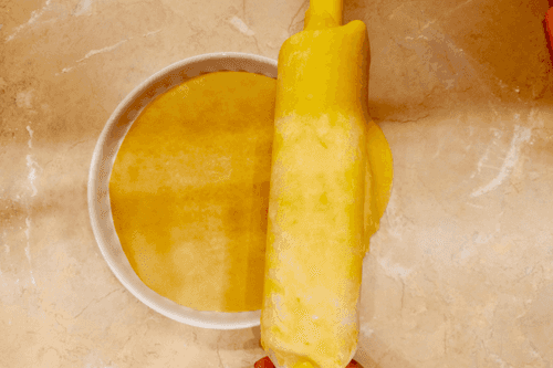 Place a circle of parchment at the bottom of the mold. Use a rolling pin to lay the dough in the mold, pressing the edges tightly against the walls, prick the bottom with a fork, and refrigerate the preparation for 40 minutes.