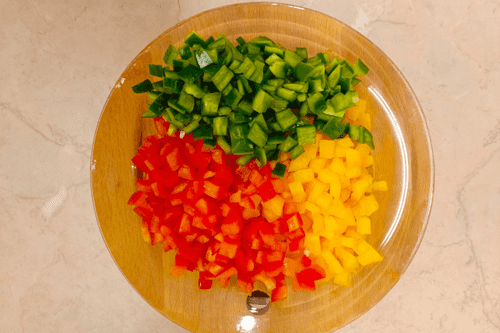 Cut the bell peppers (green, red, yellow) in half, remove the stem, clean out the seeds and partitions, and dry them. Cut each half into strips lengthwise, then into small squares crosswise.