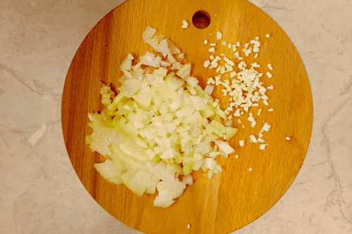 Peel and finely chop the onion and garlic.