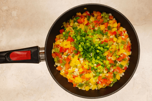 Heat vegetable oil in a pan, add 20 grams of butter, sauté the pepper for 2-3 minutes, then add chopped onion and garlic, sauté together for another 3-4 minutes, add cumin, salt, pepper, and finely chopped green onion.