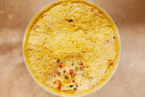 Whisk the cream lightly with 4 eggs, add cheese, pepper, salt, and nutmeg.
