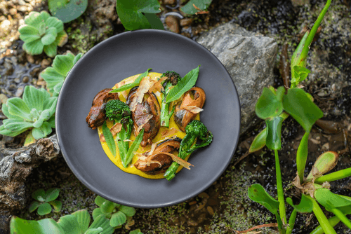 Decorate with fresh lemon verbena and sprinkle with dried zubatka shavings.