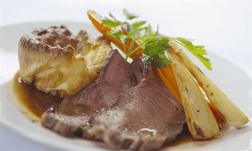 Roast beef on Yorkshire pudding with horseradish cream is an exquisite dish with British roots, combining airy pudding and tender meat with a spicy accent. Yorkshire pudding, traditionally served with roast beef, has a crispy golden crust and a soft, porous texture inside. The horseradish cream complements the flavor, adding a light sharpness and freshness to the dish. The secret to preparation is the right combination of temperature and baking time to ensure the perfect pudding texture and meat juiciness. Presentation includes small puddings topped with creamy sauce and thin slices of beef, creating a harmony of flavors and aromas. This dish is perfect for a festive dinner or cozy family gathering, captivating with its rich taste and elegant presentation.