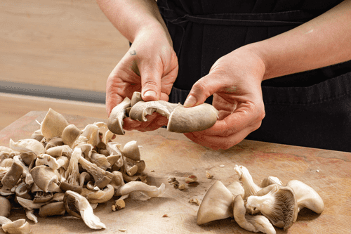 Wash the oyster mushrooms, cut off the tough 'base', divide into segments, and dry on a paper towel.