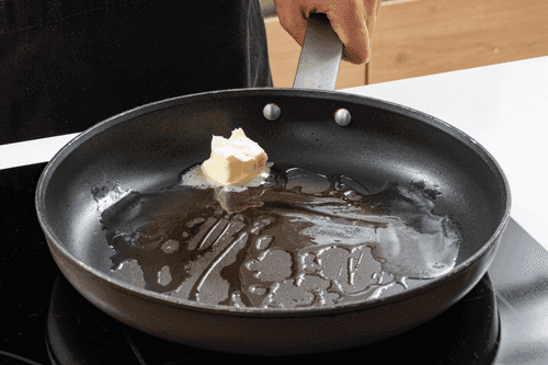 Heat vegetable oil in a pan, add butter, and let it melt.