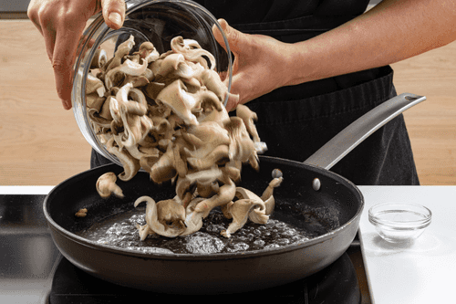 Lay the oyster mushrooms in a single layer in the pan and salt them.
