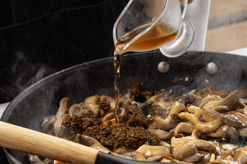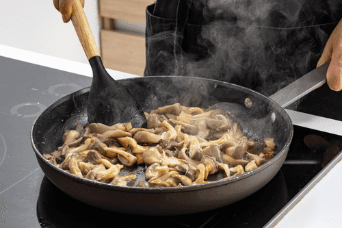 Fry the mushrooms until the excess moisture is gone. Then flip them and continue frying until they are golden brown.