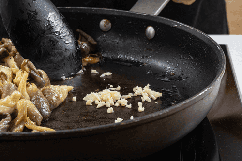 Mix garlic with oyster mushrooms, sprinkle with crushed mushrooms, pour in vinegar, and cook for a few more minutes, stirring constantly until the vinegar evaporates.