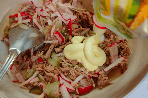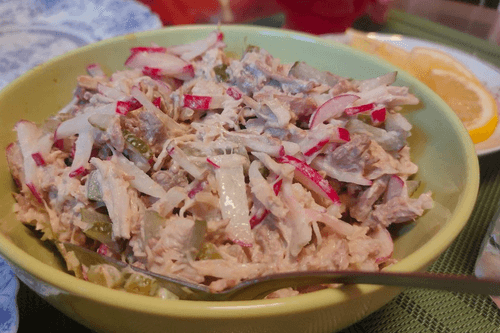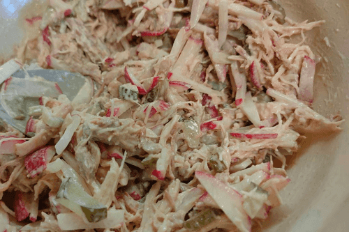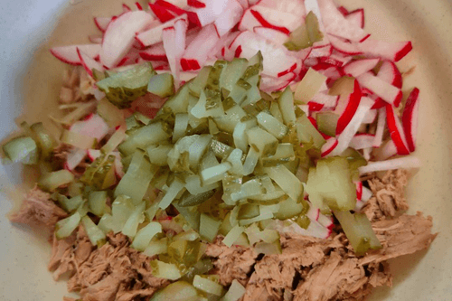 Beef and chicken salad with radishes and pickles is a vibrant combination of flavors and textures that embodies the best traditions of European cuisine. Beef adds richness to the dish, chicken provides tenderness, while radishes and pickles offer a refreshing zest. This salad can serve as a light appetizer or main course, perfect for lunch or dinner. Its roots can be found in home recipes where the balance of ingredients and flavor richness are important. A creamy mayonnaise-based dressing unites the components, creating a harmonious ensemble. Due to its versatility, this salad is suitable for festive tables or everyday meals, delighting with its rich taste and appetizing appearance.