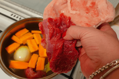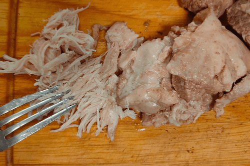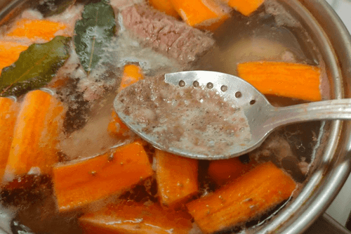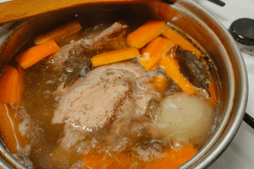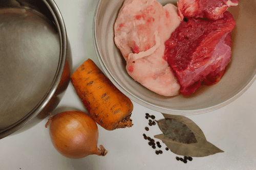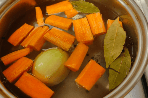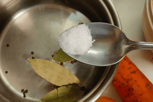 Pour water into the pot, add pepper, bay leaf, and salt.