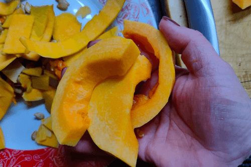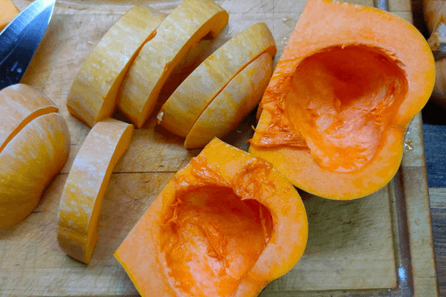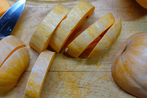 Prepare the pumpkin, cut it in half, and slice it into wedges.
