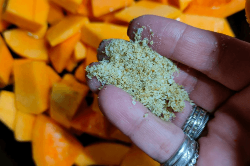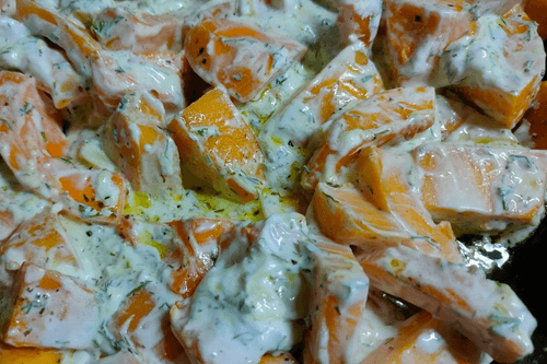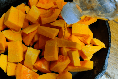 Place pumpkin cubes in a pan, add vegetable oil, and set on medium heat.