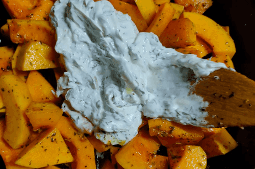 Add the cooked pumpkin to the bowl with salad leaves and cheese.
