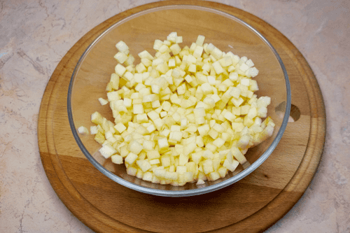 Cut the apples into cubes like herring. Drizzle with lemon juice and mix.