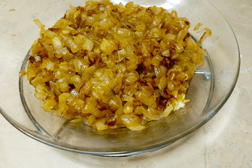 Heat vegetable oil in a pan, add onion, and fry until caramelized. Transfer the cooked onion to a bowl.