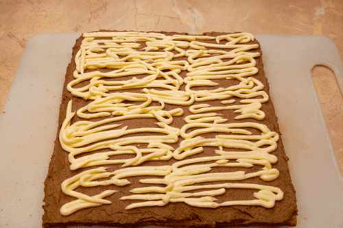 Cover with the second layer, repeat the layers from steps 12, 13, and 14. Spread mayonnaise on the edges of the cake.