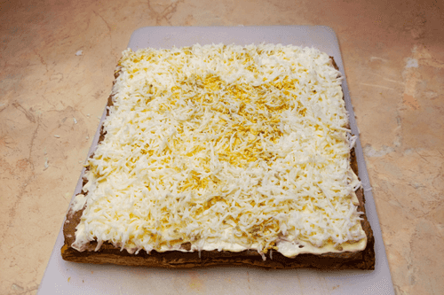 Grate 1 whole egg and 2 egg whites onto the mayonnaise, smooth it out, and cover with mayonnaise.