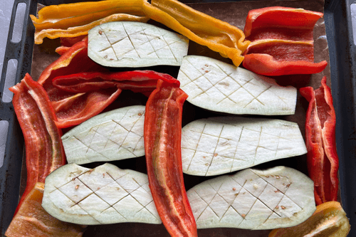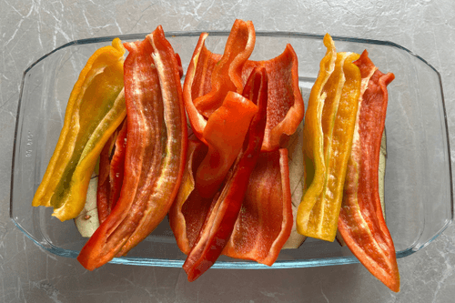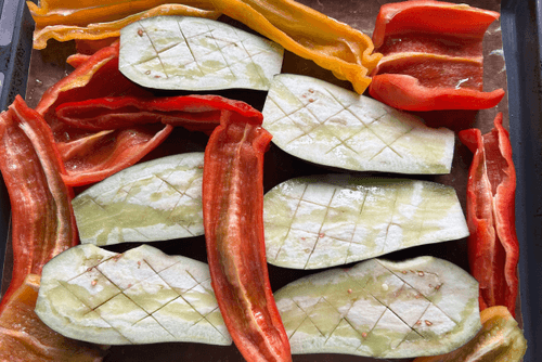 Cut the peppers and eggplants randomly.