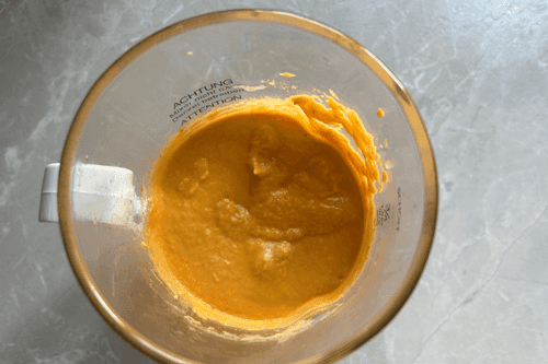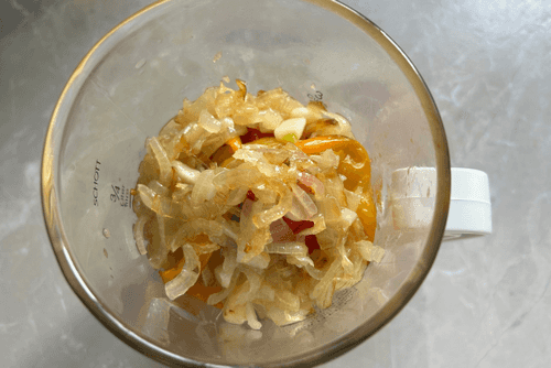 Peel the vegetables, place them in a blender. Add the sautéed onion with garlic.