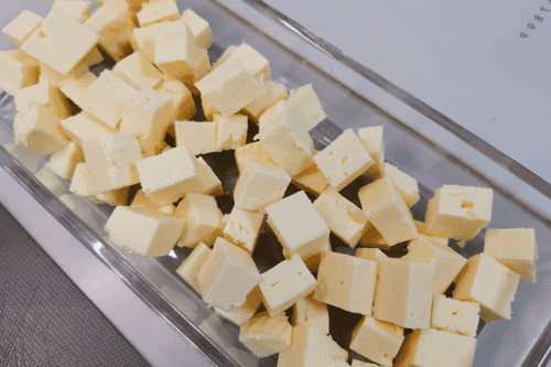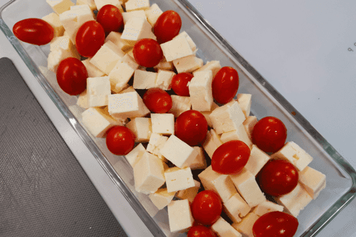 Cut the cheese into small cubes and place them in a baking dish.
