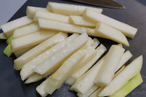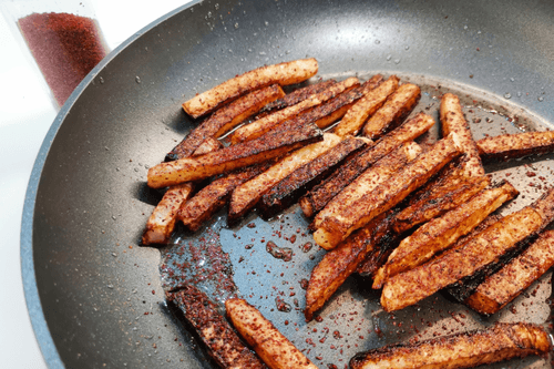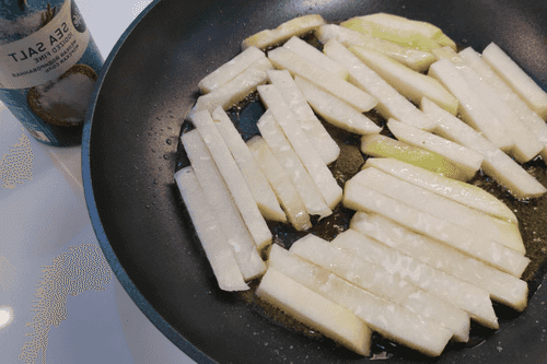 Place the kohlrabi in the pan and salt it. Fry for 2 minutes on high heat.