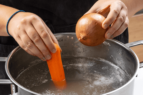 Add a whole onion and carrot. You don't need to peel the onion; the skin will give the broth a golden color. Cook for another 2 hours.