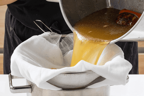 Strain the broth and add the pressed garlic. Salt to taste if needed. Discard the vegetables and the spice bag.
