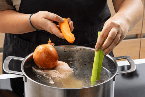 Add carrots, celery, and onion. The onion can be left unpeeled, as it will give the broth a golden color. Simmer for 4 hours.