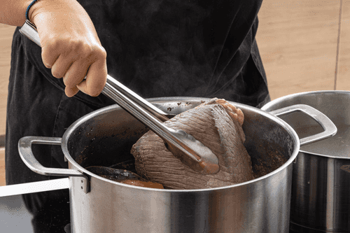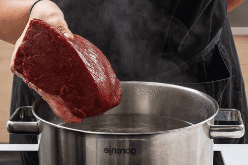 Transfer the boiled meat to a pot with broth and cook for another 3 hours, skimming off the foam if necessary. The water should reduce by about half. Half an hour before it's done, generously salt the broth. It should taste slightly salty.