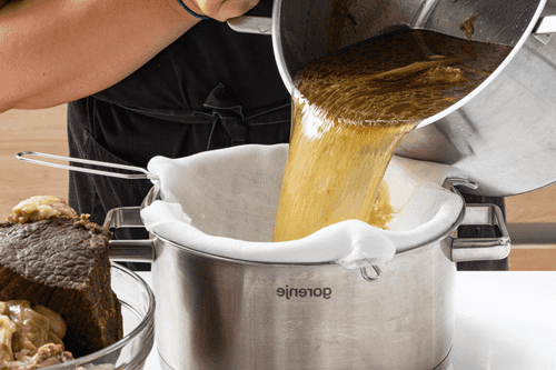 Strain the ready broth, let the meat cool slightly, and discard the vegetables and peppercorns. To ensure the broth will set without gelatin, dip a finger in it and wait for it to dry — the finger should become sticky.