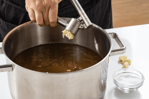 Add crushed garlic through a press to the broth and salt if needed.