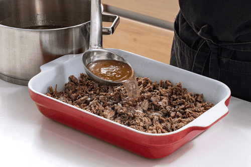 Place the meat in one large container or individual molds for aspic. Pour in the broth, cool completely, and refrigerate until set.