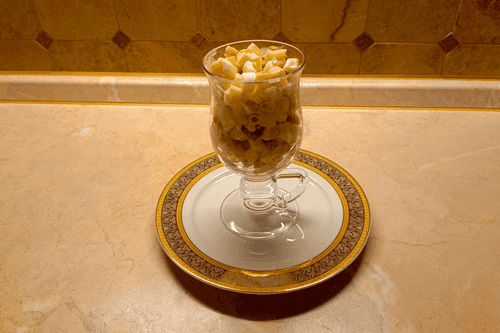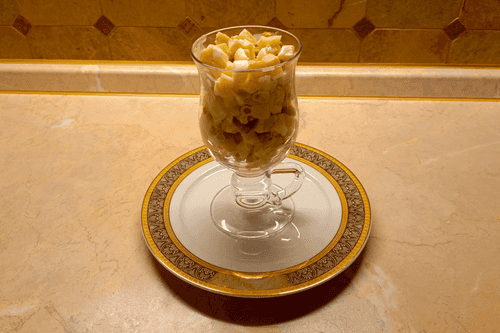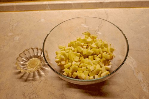 Cut the apples into cubes and drizzle with lemon juice.