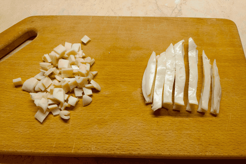 Cut the cooled squid into long strips and then into cubes, like apples.
