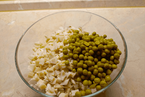 Drain the brine from the green peas, add the peas to the apples and squid.