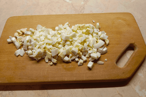 Boil the eggs hard, then cut them into cubes.