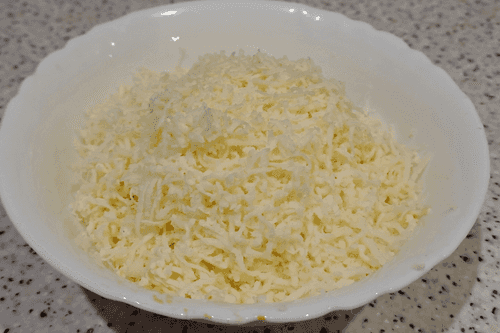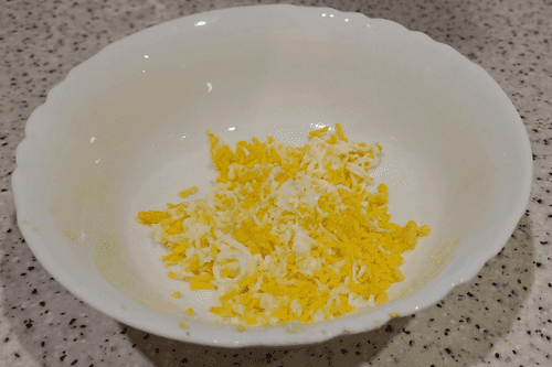 Grate the mozzarella on a fine grater and add it to the container with the grated egg, carrot, and processed cheese.